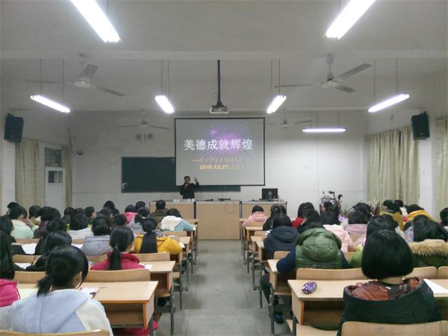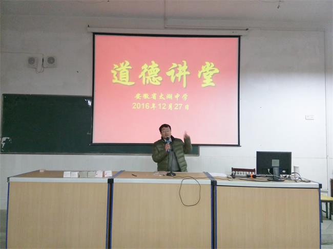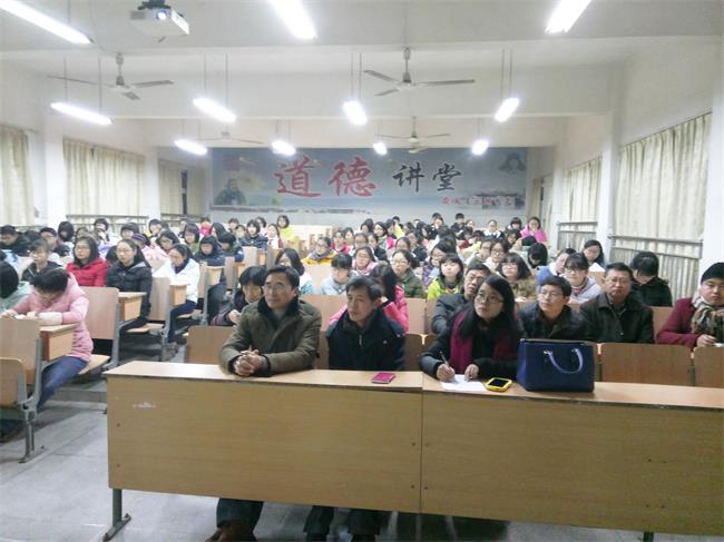 12月27日晚,我校在勤学楼阶梯教室举行本学年第三期道德讲堂。本期道德讲堂由校团委书记陈占中主持,太湖县龙山书院副院长、国学讲师张瑛老师主讲。太湖县龙山书院部分会员,高一、高二文科实验班同学参加听课。