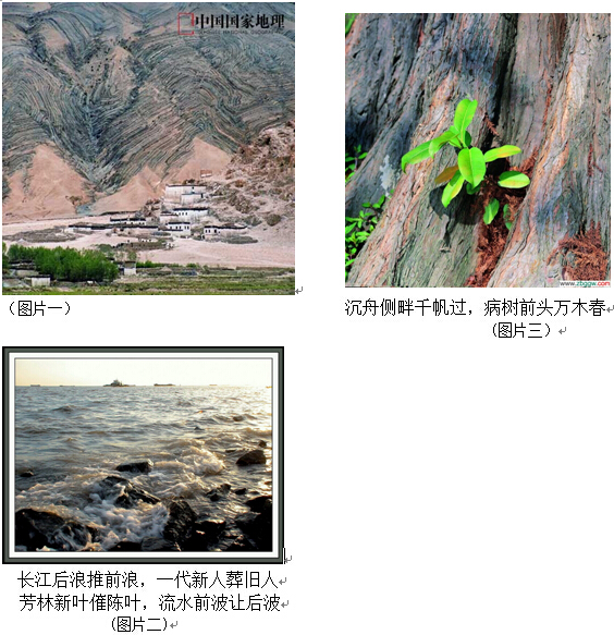 教材介绍的是当今世界屋脊青藏高原在距今2亿年至4000万年却是一片汪洋大海,多媒体展示图片“世界屋脊”的变化——有“斗转星移,沧海桑田”的感叹(图片一),“长江浪花”图片及相关诗句有“长江后浪推前浪,一代新人葬旧人”、“芳林新叶催陈叶,流水前波让后波”等——形容人才的辈出(图片二)。“枯木逢春”的图片——说明“沉舟侧畔千帆过,病树前头万木春”。(图片三)斗转星移,沧海桑田,世界屋脊的变化过程。