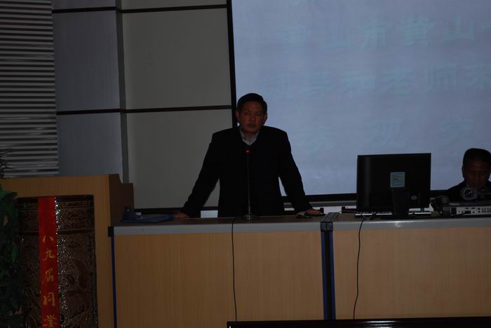 2013年3月7日下午,黄山一中高三全体老师在唐月江校长、方斌副校长的带领下,来我校参观交流。唐校长一行首先在副校长李昭平、团委书记陈占中的带领下参观了校园,随后到勤学楼多功能报告厅进行交流。潘德安校长向大家介绍了我校的基本情况和管理机制,陈占中介绍了我校2013年高考备考情况和主要措施,李昭平应方斌副校长的邀请给大家作了《 科学备考 提高质量》专题报告。会后,校领导与黄山一中全体人员合影留念。