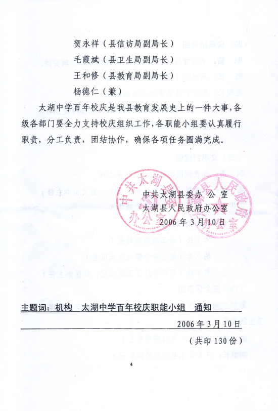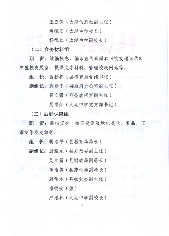 关于成立太湖中学百年校庆职能小组的通知--中共太湖县委办公室文件
