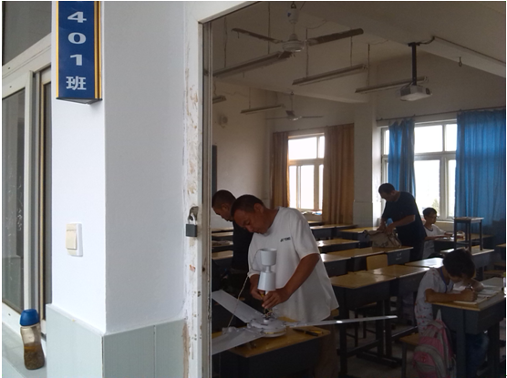 不定期进行校园设施安全大检查,图为电工更换损坏的吊扇。