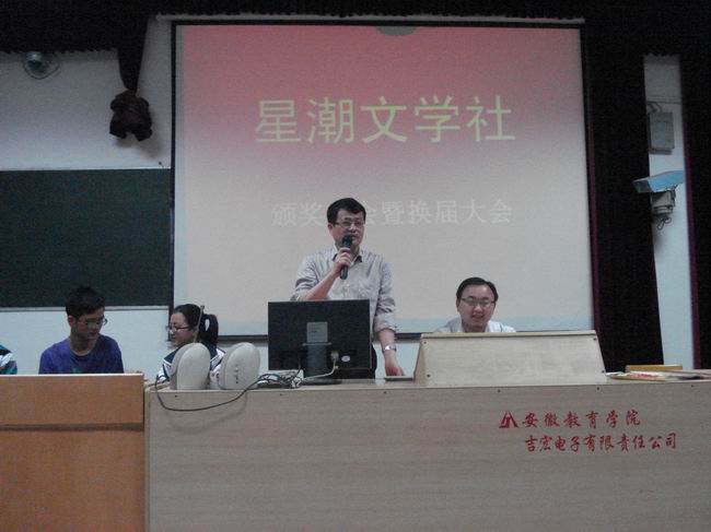 2013年5月5日下午,在庆同楼多媒体教室,我校的两个文学社团—星潮文学社和晴轩文学社先后举行了换届大会暨颁奖仪式。李昭平副校长出席会议,并分别做了精彩发言。他从提高学生综合素质的角度,分析了文学社团在高中教育阶段所起的重要作用,同时对参加会议的文学社社干和社员提出了殷切期望。随后文学社指导教师陆常兴分别对两个社团的老一届社干在过去一年所做的工作给予表扬,并对新一届社干提出了具体要求。接着,两个文学社分别对参加“文心雕龙杯”征文比赛的获奖同学进行了表彰。最后,两个文学社的新社长上台发言,表达了他们搞好服务的决心和举措。大会在同学们热烈的掌声中圆满结束。