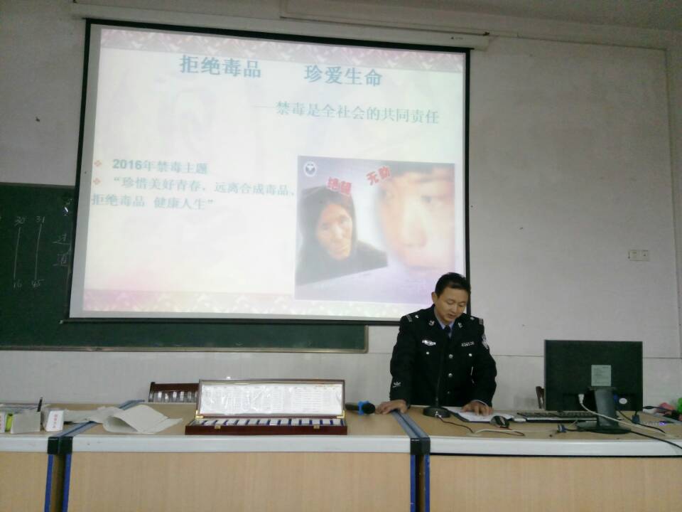首先,陈占中介绍了我校作为“安庆市禁毒示范学校”和“太湖县毒品预防教育基地”在禁毒方面所做的工作和取得的成绩。然后甘勇做了题为《珍爱生命,远离毒品》的讲座,分别从毒品的种类、毒品的危害、如何远离毒品、珍爱生命等几个方面做了生动的讲解。甘勇结合身边事例,生动形象的讲解了毒品的相关知识。通过图片展示、视频展示,样品展示,让学生全面的了解了毒品的危害、意识到生命的可贵、青春的无价。